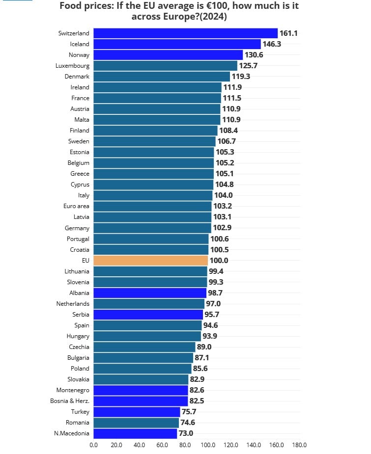 Jugoistočna Europa i Zapadni Balkan pokazuju najniže cijene hrane ukupno. Osim Sjeverne Makedonije i Rumunjske, Turska (75,7 eura), Bosna i Hercegovina (82,5 eura), Crna Gora (82,6 eura) i Bugarska (87,1 eura) znatno su ispod prosjeka EU.