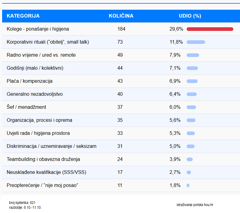Anketu, provedenu od 6. do 11. listopada na društvenim mrežama i u newsletteru, pogledalo je preko 18.000 korisnika, od kojih je izravno sudjelovalo više od 620. U njihovim odgovorima uvjerljivo najveći izvor svakodnevne radničke frustracije, s udjelom od 29,6%, nije mala plaća, već ponašanje kolega i loši međuljudski odnosi.