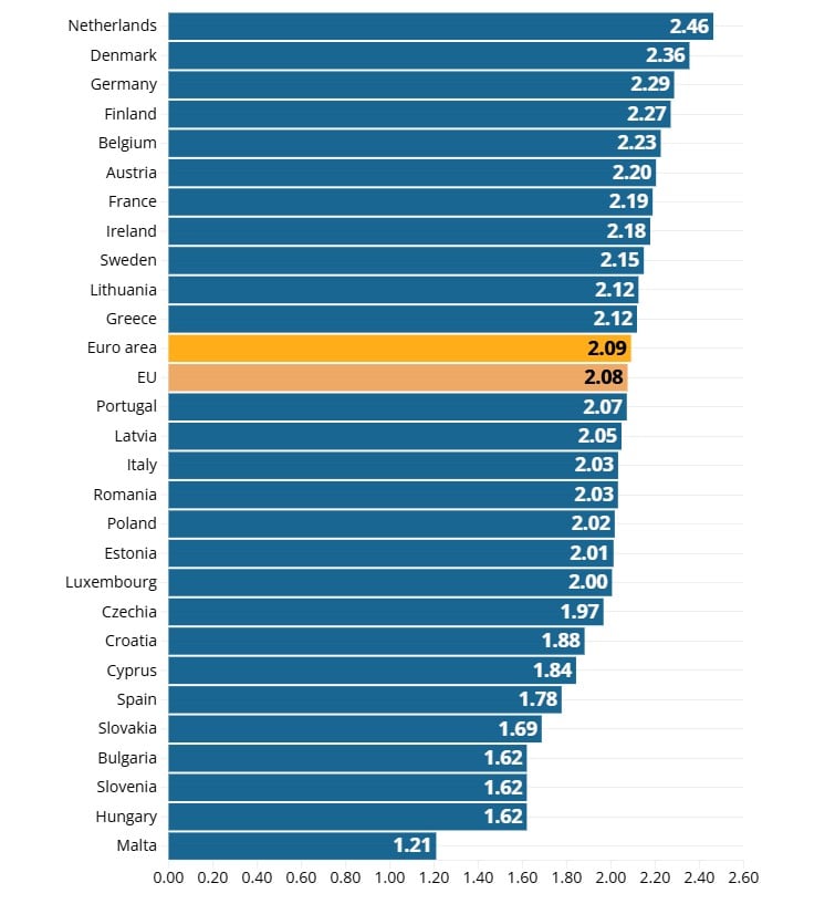 Najskuplji dizel je u Nizozemskoj, Danskoj i Njemačkoj. Unutar EU, cijene dizela po litri kreću se od 1,21 eura na Malti do 2,46 eura u Nizozemskoj.