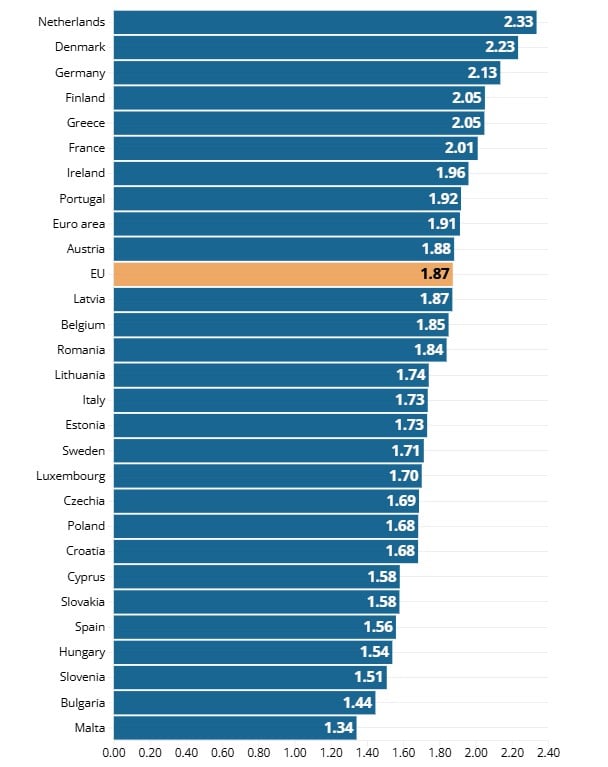 Također je ispod 2 eura po litri u Slovačkoj (1,69 eura), Španjolskoj (1,78 eura), Cipru (1,84 eura), Hrvatskoj (1,88 eura) i Češkoj (1,97 eura).