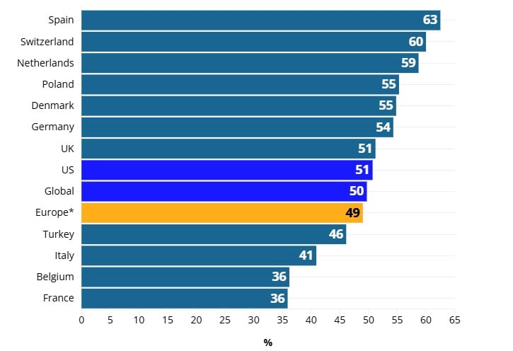Turska (46%) i Italija (41%) također su bile ispod europskog prosjeka. U Njemačkoj je ta brojka iznosila 54%, a u Velikoj Britaniji 51%. Za usporedbu, globalni prosjek bio je 50%, dok je u SAD-u zabilježeno 51%.