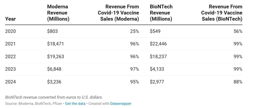 Od 2021. godine Moderna i BioNTech gotovo su u potpunosti oslanjali svoje prihode na prodaju cjepiva protiv Covida-19. To je i dalje slučaj, više od dvije godine nakon završetka pandemije.
