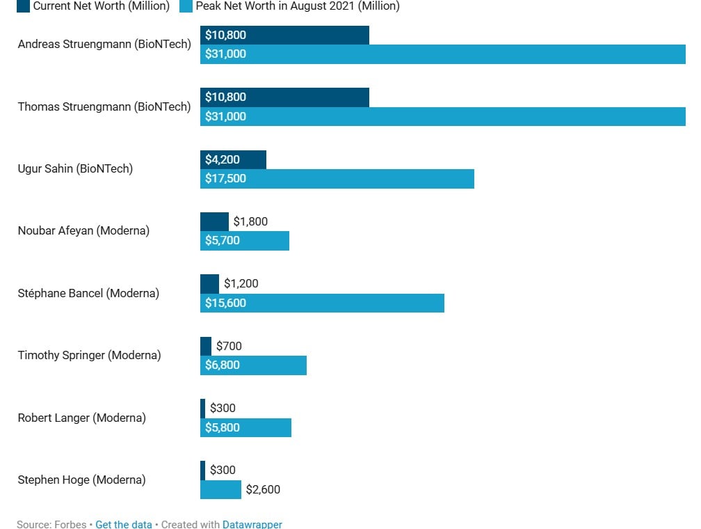 Forbes je 2021. izbrojao osam milijardera iz BioNTecha i Moderne s ukupnim bogatstvom od 116 milijardi dolara. Danas troje od njih više nisu milijarderi, a ostali vrijede svega 28,8 milijardi dolara.