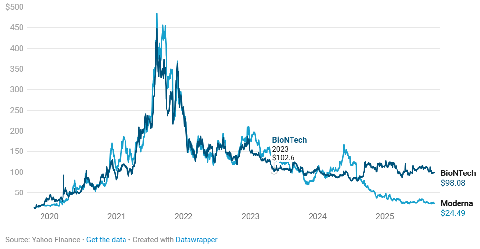 Cijene dionica Moderne i BioNTecha urušile su se nakon pandemije Covida-19 – dionice Moderne pale su 95 posto u odnosu na vrhunac u kolovozu 2021., dok su dionice BioNTecha izgubile 78 posto vrijednosti.