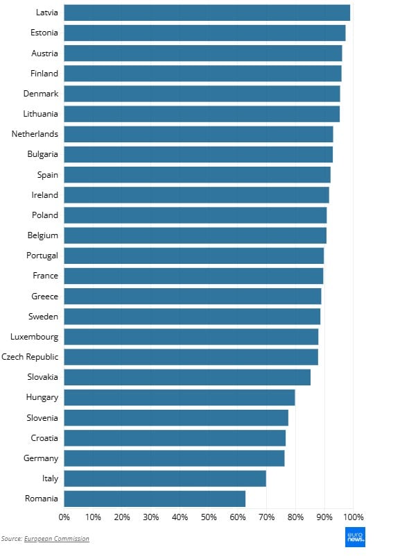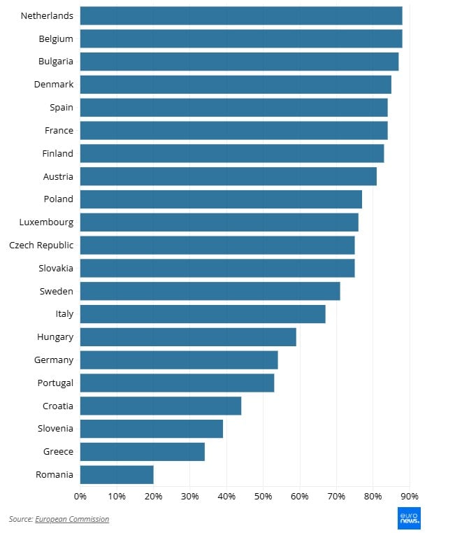 Nizozemsku su slijedile Belgija, također s 88%, ali neznatno pala na ljestvici zbog rezultata iz prethodnih godina, te Bugarska s 87%.
