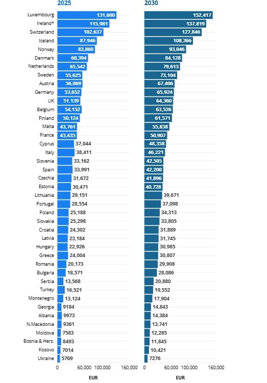 Među 41 europskom zemljom – uključujući članice EU-a, zemlje kandidatkinje, članice EFTA-e i Ujedinjeno Kraljevstvo – Irska će prema projekcijama do 2030. godine zauzeti vrh tablice BDP-a po stanovniku prema paritetu kupovne moći, istiskujući Luksemburg, koji je vodeći 2025. godine.