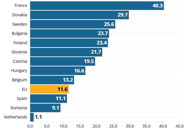 Od 2024. godine, Francuska ima daleko najveći udio nuklearne energije s 40,3%. Slovačka je na drugom mjestu s 29,7%, a slijede Švedska (25,6%) i Bugarska (23,7%).