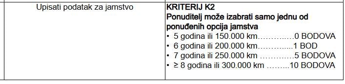 Najveći broj bodova u tom dijelu odnosno grupi natječaja – njih 60 – donosi cijena. Tu su i drugi kriteriji poput snage motora, emisija CO2 i razvijenosti servisne mreže koji donose po 10 bodova. Po dva boda donose manji kriteriji: potpora za nadzor mrtvog kuta vozila. tvornički zatamnjena stražnja bočna i stražnje staklo vozila ili jednakovrijedno, kompletna svjetla u led tehnologiji, sustav automatskog kočenja prilikom naleta na pješaka ili prepreku sprijeda te grijanje prednjeg stakla. Ne radi se klasičnom grijanju prednjeg stakla zrakom kakav imaju svi automobili, nego grijanja nitima u staklu, puno tanjima i teže primjetnima od onih koje su vidljive na stražnjim staklima vozila.