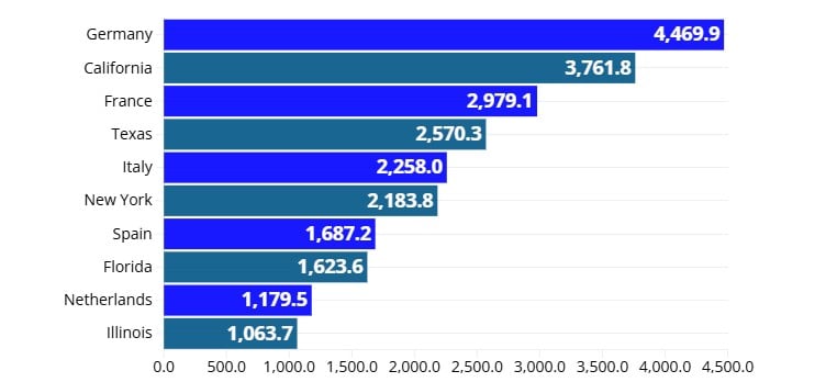 Prema Eurostatu i Zavodu za ekonomske analize, među 10 gospodarstava, Njemačka ima najveći BDP od 4,47 bilijuna eura od 2025. Kalifornija je na drugom mjestu s 3,76 bilijuna eura.