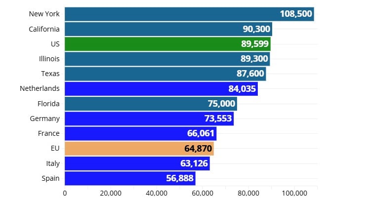 Nizozemska ima najveću vrijednost među vodećim gospodarstvima EU-a s 84.035, dok Florida, sa 75.000, ima najnižu razinu među američkim saveznim državama.