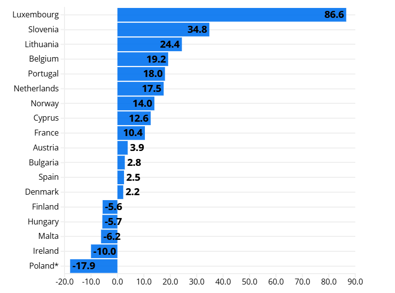 Među zemljama EU koje su zabilježile povećanu prodaju, stanje je različito, s godišnjim rastom u rasponu od 2,2% u Danskoj do 86,6% u Luksemburgu, koji ima vrlo malo tržište nekretnina na kojem male promjene mogu značajno utjecati na stope prodaje.