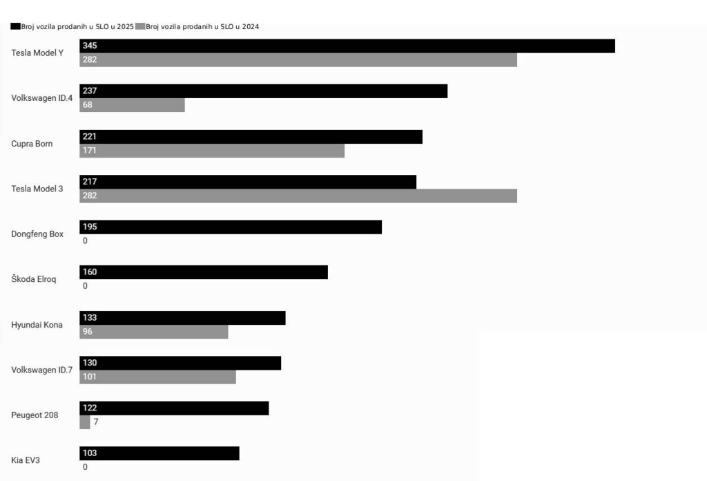 Treća je bila Cupra Born s 221 prodanim automobilom, što je gotovo 30-postotni godišnji rast, dok je marka ukupnu prodaju u Sloveniji povećala za gotovo 75 posto. Škodin Enyaq našao se na šestom mjestu sa 160 prodanih vozila u prvoj godini na tržištu, odmah iza Dongfengova Boxa, također novajlije na slovenskom tržištu.