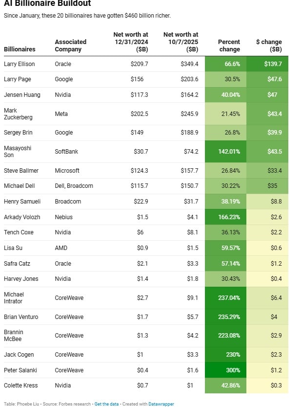 Najveći dobitnik je Larry Ellison, suosnivač i tehnički direktor Oracla, čije je bogatstvo poraslo za 140 milijardi dolara zahvaljujući skoku vrijednosti dionica za 73 posto. To je posljedica procjena da će Oracleov prihod od računalne infrastrukture za umjetnu inteligenciju narasti s 18 na 144 milijarde dolara u iduće četiri godine.