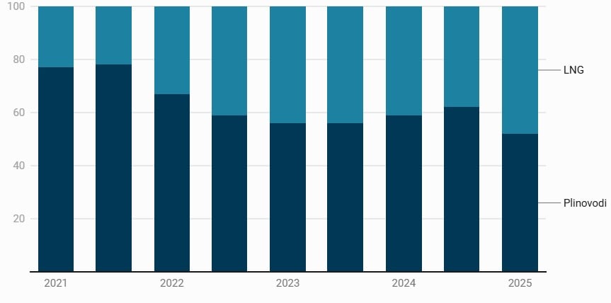 Udio plina iz plinovoda pao je s 77 posto prije rata na ovogodišnjih 52 posto ukupnog uvoza, dok se udio LNG-a povećao s 23 na 48 posto. Najveći dio uvoza LNG-a stiže preko Atlantika: prošle godine SAD su činile 45 posto uvoza LNG-a, a u prvoj polovici ove godine čak 57 posto.