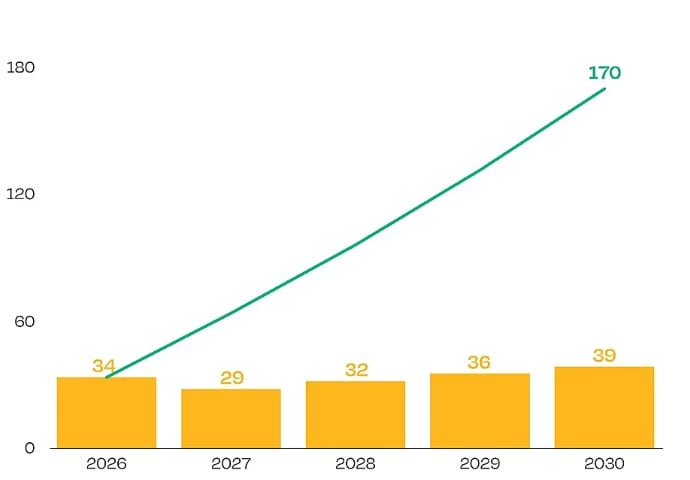 Godišnje i kumulativne uštede u uvozu plina u EU-u zahvaljujući proizvodnji električne energije iz solarnih panela od 2026. do 2030. (u milijardama eura)