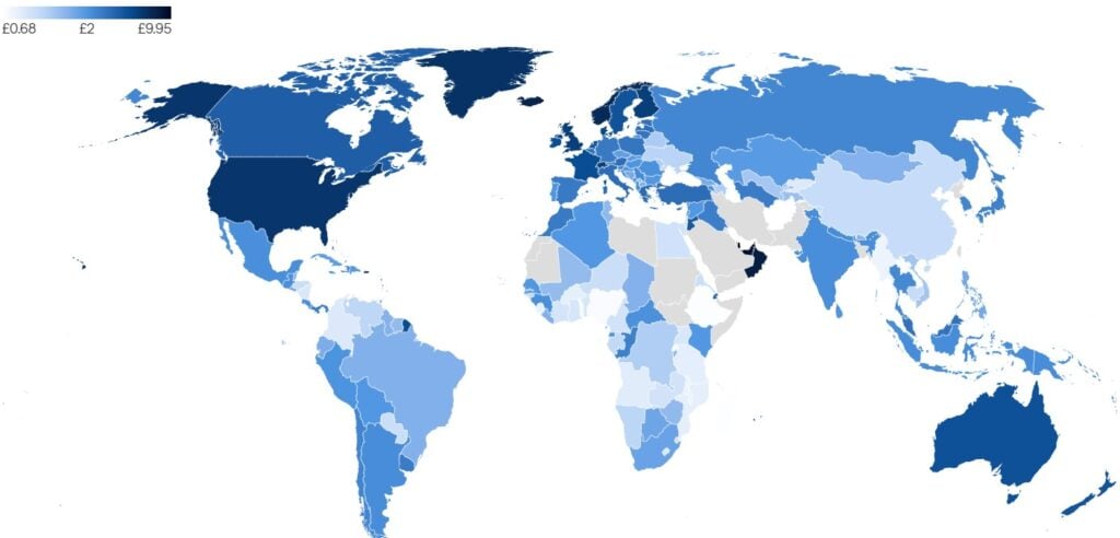 Svjetski prosjek, izračunat na temelju 155 glavnih gradova, iznosi 3,26 eura u 2025. godini — gotovo jednako prošlogodišnjem prosjeku od 3,25 eura.
