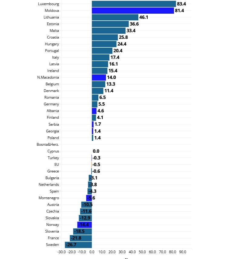 Na primjer, dok je Grčka bila neto uvoznica sa stopom od 10% u 2023., postala je neto izvoznica u 2024. s ukupnim padom od -0,6%. Slično tome, hrvatska stopa neto uvoza naglo se povećala s 10% na 26% u istom razdoblju.