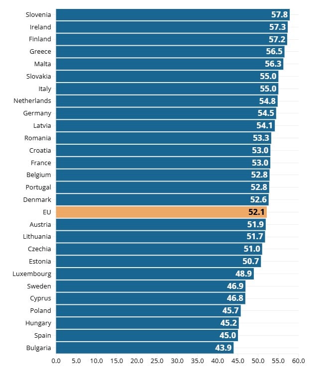 Udio poreza je ispod 40% u Estoniji (37,6%), Španjolskoj (38%), Švedskoj (38,5%) i Bugarskoj (39,7%).