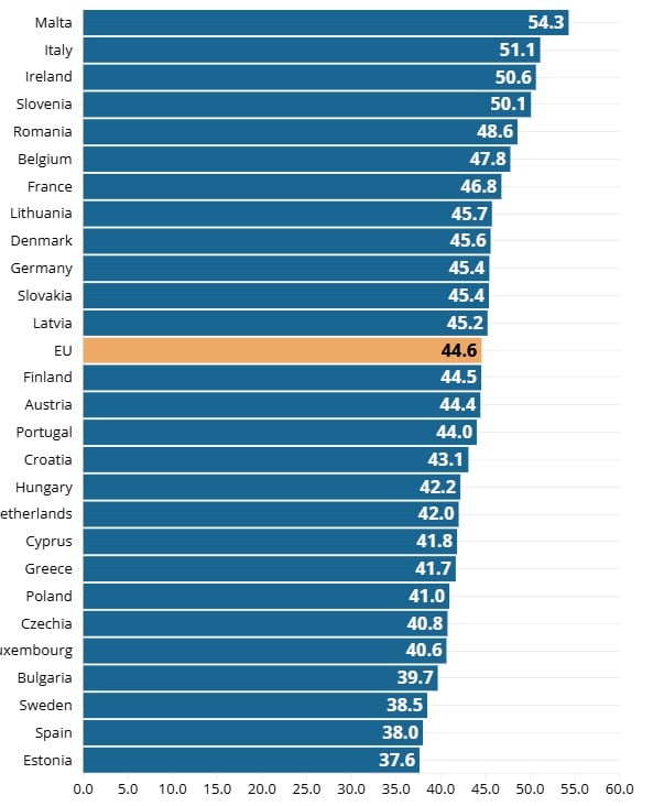 Među “velikom četvorkom” gospodarstava EU-a, Italija ima najveći udio poreza s 55%, a slijede Njemačka (54,5%), Francuska (53%) i Španjolska (45%).