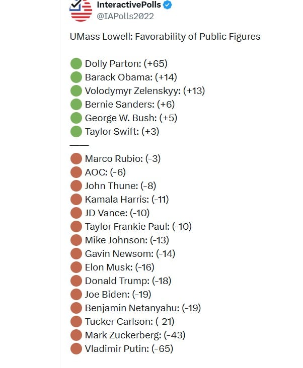 Pa, on je na –18, što znači da je kraljica country glazbe ispred njega za čak 83 boda. Niže na listi nalaze se Joe Biden (-19), Benjamin Netanjahu (-19), Tucker Carlson (-21) i Mark Zuckerberg (čak –43). Vladimir Putin zauzima samo dno prema mišljenju Amerikanaca, s -65, što znači da je u suštini potpuna suprotnost Parton.