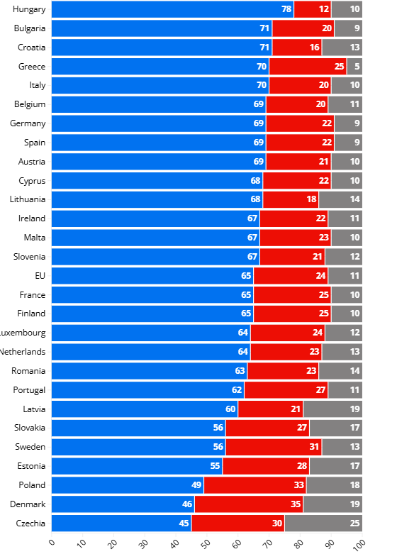 Osim u te dvije zemlje, podrška iznosi najmanje 70 posto u Bugarskoj, Rumunjskoj, Hrvatskoj i Grčkoj, dok pada ispod polovine u Poljskoj i Danskoj.
