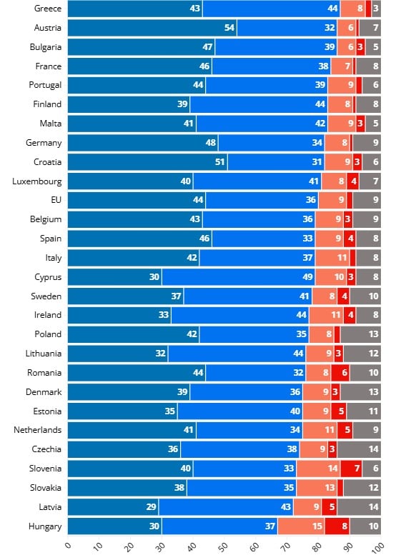 Diljem EU 80 posto ispitanika se slaže. Od toga se 44 posto u potpunosti, a 36 posto djelomično. Podrška se kreće od 67 posto u Mađarskoj do 87 posto u Grčkoj.