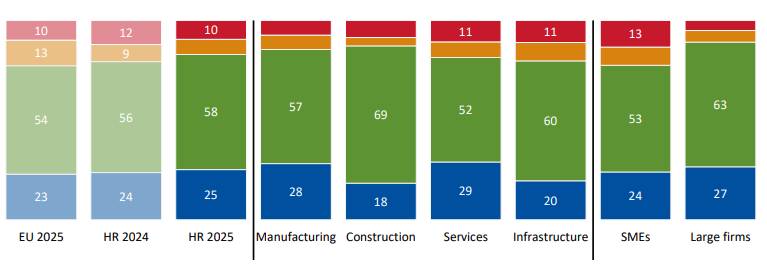 Prilično iznenađuje i činjenica da su tvrtke u Hrvatskoj pozitivnije su od prosjeka EU-a u procjeni dostupnosti vanjskog financiranja – 14 posto prema 2 posto, a isto vrijedi i za poslovne izglede u svom sektoru – 10 posto prema 0 posto. Obrazloženje za ovakav optimizam se ne navodi.