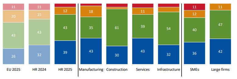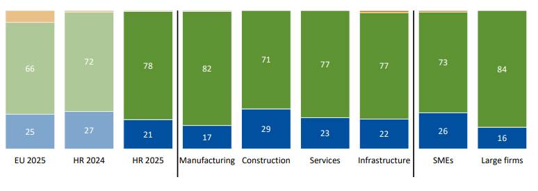Percepcija prepreka ulaganju uglavnom je ista kao u prošlogodišnjem istraživanju. Najveći izazov ostaje dostupnost kvalificirane radne snage, koju preprekom smatra 90 posto hrvatskih tvrtki — znatno iznad prosjeka EU-a (79%). Slično europskom prosjeku, mnoge tvrtke koči neizvjesnost (84%), cijene energije (77%), propisi tržišta rada (67%) i poslovni propisi (64%).