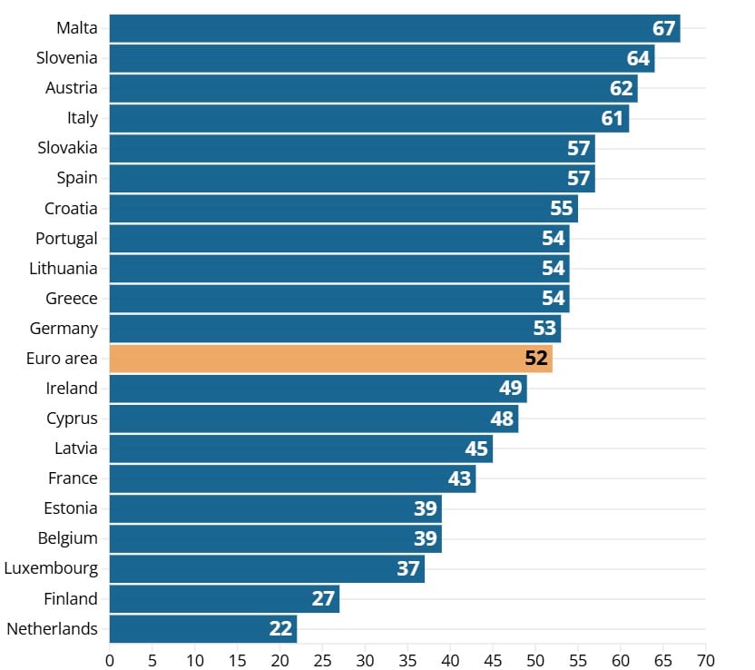 Među četiri najveća gospodarstva EU-a, Francuska je jedina nacija ispod prosjeka eurozone od 52%, dok je Njemačka nešto iznad toga, s 53%.