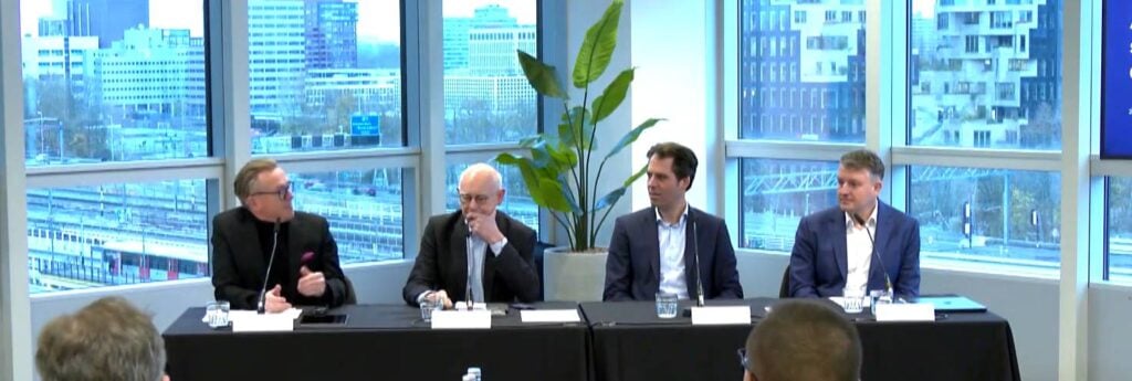 Pressica u Amsterdamu na kojoj je ponovno predstavljen Qivalis i najavljen ulazak BNP Paribas banke u projekt. Na fotografiji: predsjednik Nadzornog odbora Qivalisa Sir Howard Davies (drugi s lijeva), financijski direktor (CFO) Floris Lugt (treći s lijeva) i glavni izvršni direktor (CEO) Jan-Oliver Sell (skroz desno); Screenshot: Live prijenos Quivalisove pressice