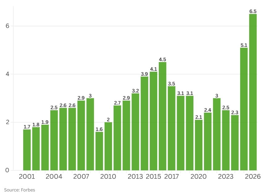 Prema najnovijoj procjeni Forbesa, ažuriranoj u ožujku, Donald Trump posjeduje bogatsvo vrijedno 6,5 milijardi dolara. Trump ga je u proteklih godinu dana povećao za 1,4 milijarde dolara, koristeći pritom obilno predsjedničku funkciju. Njegovi kripto projekti, koji su stagnirali prije izbora, nakon pobjede su eksplodirali i ukupno mu donijeli procijenjenih 1,8 milijardi dolara. Dodatnih 500 milijuna dolara ostvareno je na sudu, gdje je njegov pravni tim uspio poništiti presudu vrijednu pola milijarde dolara. Njegov nekad uspavani posao licenciranja porastao je za 400 milijuna dolara, a strani investitori pohrlili su poslovati s američkim predsjednikom.