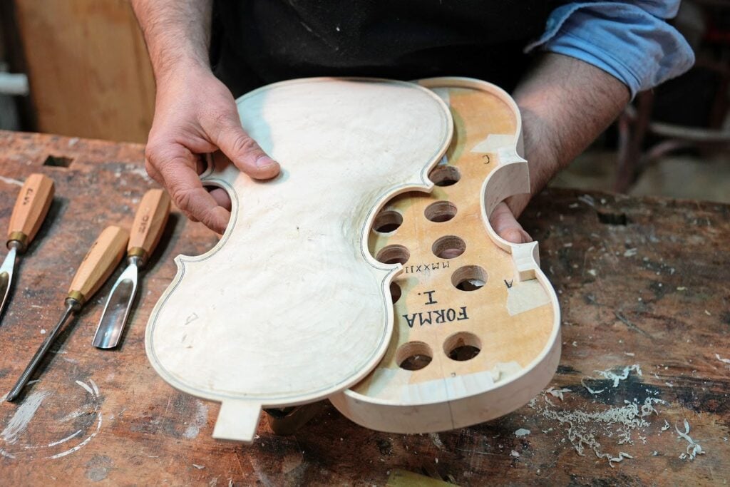 Za izradu violina koristi drvo vrhunske kvalitete: za donju ploču javor rebraš, a za gornju ploču smreku, jer smreka ima najbolja akustična svojstva.